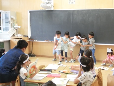 1-3は国語で学習した「おおきなかぶ」の音読劇をしていました。「うんとこしょ、どっこいしょ。まだまだかぶはぬけません。」