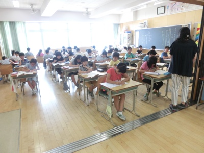 昔は終業式だけで「さようなら」でしたが、今は授業時数確保のために終業式の日でも5時間授業です。4-2はテストをしていました。