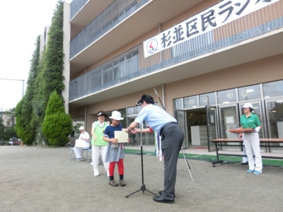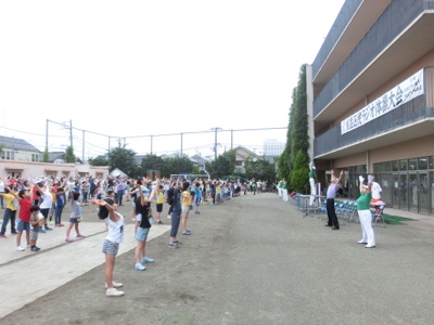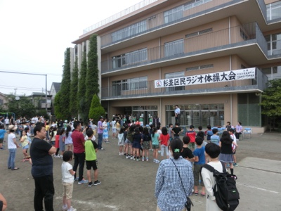 今日からラジオ体操が始まりました。今回、天沼小学校会場が「杉並区民ラジオ体操大会」の表彰式の会場となり、はじめに区長代理の方の挨拶がありました。