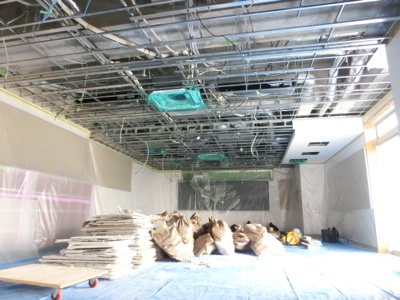3階のトイレを移設するには、配管を動かさなければなりません。ここはその真下、5-1の教室ですが、天井を全て剥がして3階の配管がむき出しになっています。夏休み明けには5-1は元に戻るのでご安心ください。