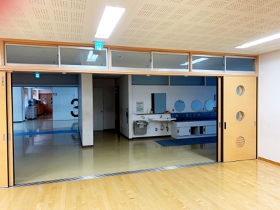 上の画像の少し左側です。裏にあるトイレと流しが見えます。ここを全て取り壊し、教室に作り変えて2階・4階と同じようにします。この2つの画像は、まだ工事が始まる前の様子です。