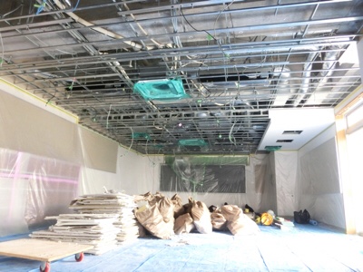 ▲今日はすっかり元に戻っていました。すごいですね。上の配管を取り払うために外した天井は新品になっています。