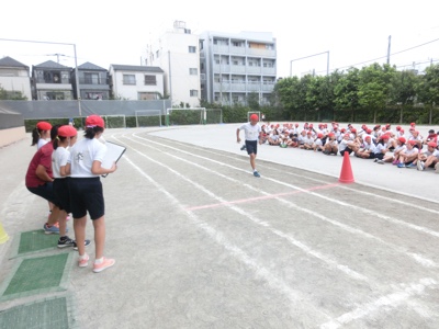 5年生は100m走のタイムを計っていました。