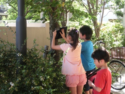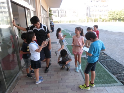 3-1が校庭で理科の観察をしていました。1人1台のタブレットを使って生物の画像を撮影します。