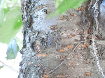 わかりますか?この赤い斑点はキマダラカメムシの幼虫ですね。