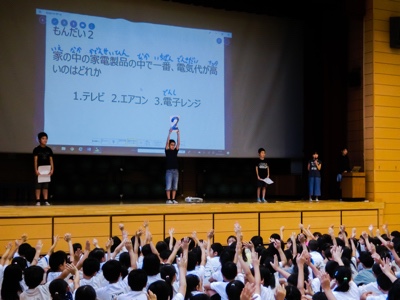 どのようにしたら節電ができるのか、クイズで問いかけながら子どもたちの意識を高めました。