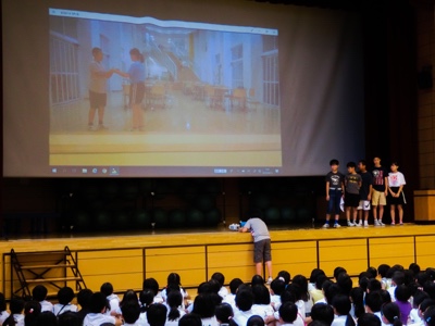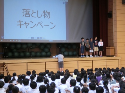 続いて美化委員会です。子どもたちが撮影した動画を見せながら、落し物について注意喚起しました。