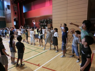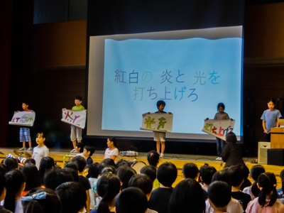 今朝は音楽集会です。集会の前に、代表委員会から運動会のスローガンの発表がありました。「紅白の炎と光を打ち上げろ」だそうです。