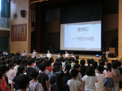 今日の音楽集会、1曲目は「世界に一つだけの花」。