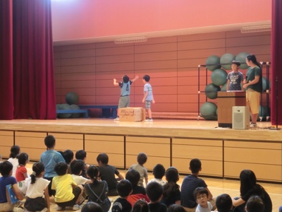 今日の集会は、映画のワンシーンを演じて見せてタイトルを当てるゲームでした。ちなみにこれは「アラジン」だそうです。