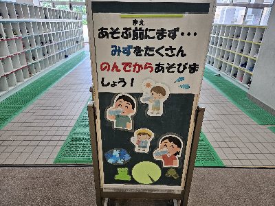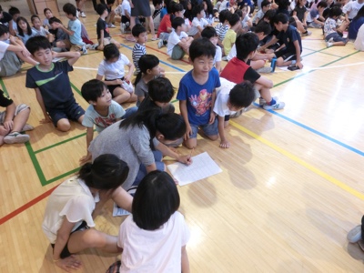 集会委員会が企画した前期最後の児童集会です。いつものように縦割り班でクイズに回答するので、班の番号を掲げて集合させます。