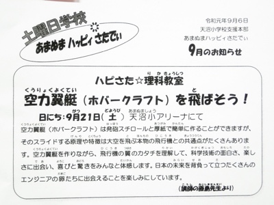 今日は、学校支援本部(AW)主催の土曜日学校「ハピさた」です。JAXAのキットを使って空力翼艇を作ります。