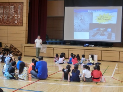 はじめに、講師の日本少年宇宙団の藤島先生から宇宙開発やはやぶさ2についてのお話をしてもらいました。