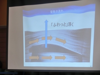 そして、飛行機が飛ぶ原理である揚力(ふわっと浮く力)を生み出す形について教えてもらいました。今日の工作はこれを利用します。