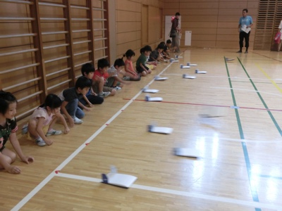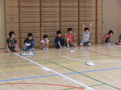 床の上を少しだけ浮き上がって滑るように飛ぶ空力翼艇を見て子どもたちは大喜びです。