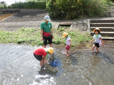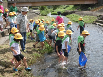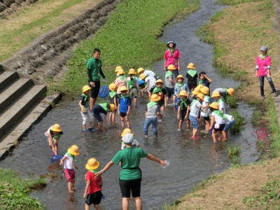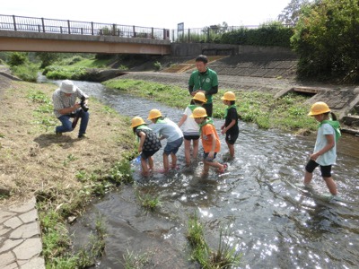 こだま学級の1年生もほかの子どもたちと一緒になって川遊びを楽しんでいました。