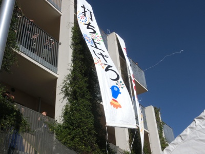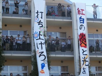 スローガンの発表。「紅白の炎と光を打ち上げろ」の垂れ幕が下がりましたが、風が強かったので引き上げました。