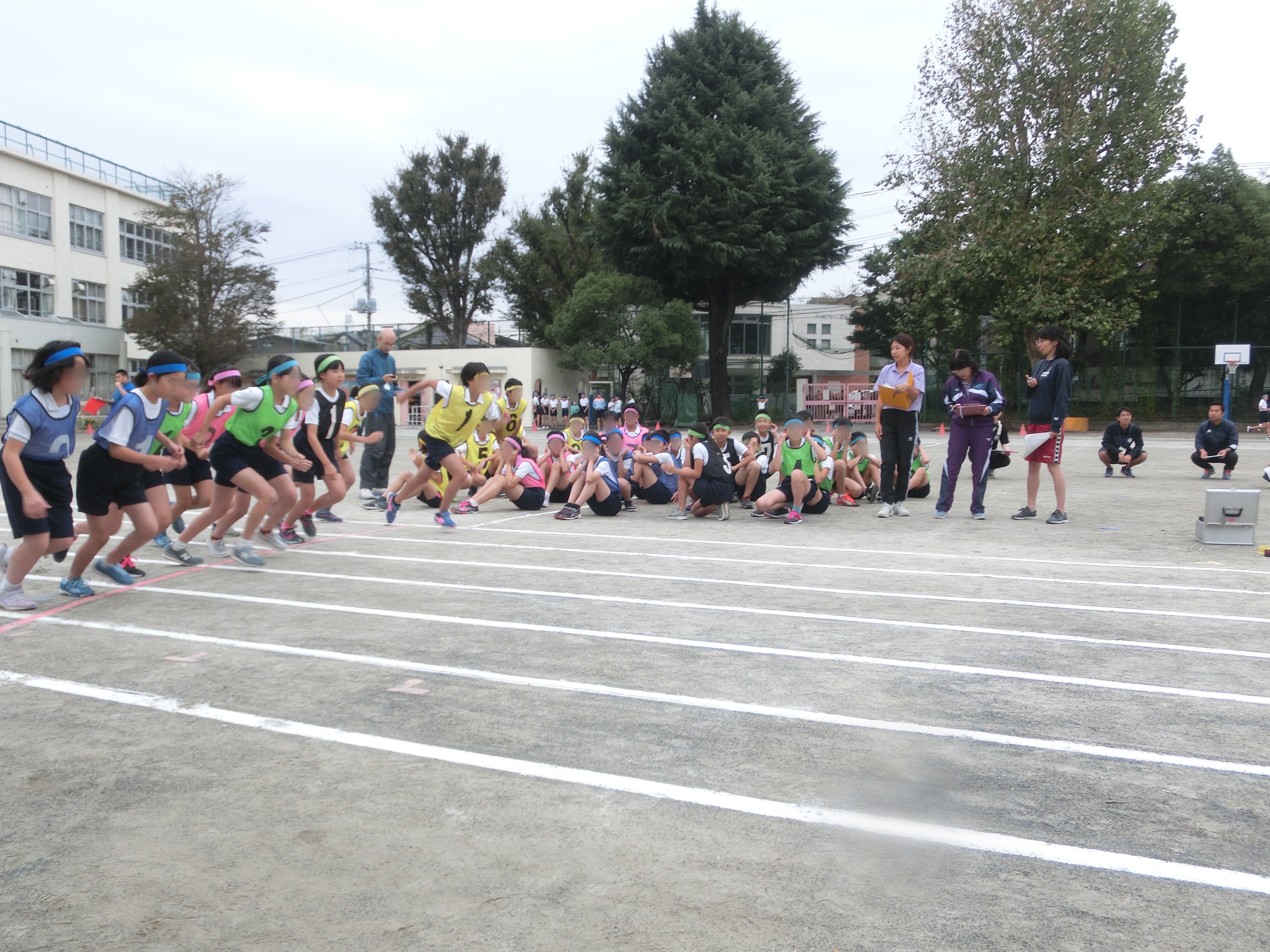 今日は3分区の連合運動会でした。天沼小、沓掛小、桃井第五小、杉並第九小、八成小の5校で「第3分区」というグループになっています。5校の6年生が沓掛小の校庭に集まって競技をします。これは女子1000m走のスタートです。