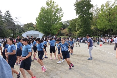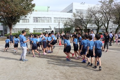 続いて「長縄グランプリ」の開会式です。天沼小からは5年生の部に1チームが出場しました。運動会の藍染Tシャツを着ています。