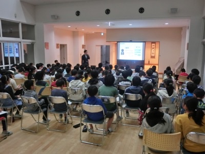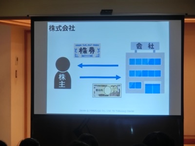 会社としてどんな組織が必要かなど、細かくお話を伺いました。5年生は真剣に聞いています。