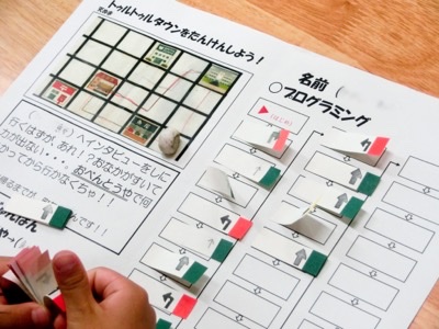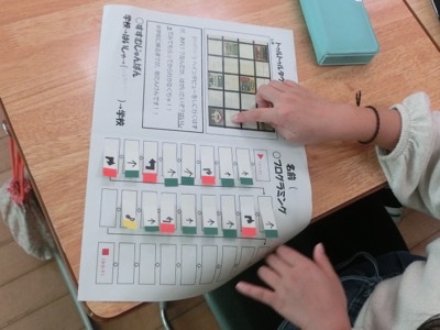 今日は「True True(トゥルトゥル)」という小型のロボットを地図の上で指示どおりに動かすプログラミングを体験しました。まっすぐ進む、右を向くなどの指示を使います。