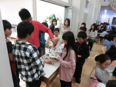 センターコートで朝食です。卒業した中学生が今朝も手伝ってくれました。