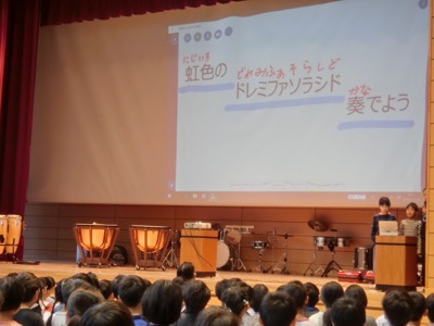 最後に、代表委員会から、音楽会のスローガンが発表されました。子どもたちから出てきた言葉を使って決めたそうです。「虹色の ドレミファソラシド 奏でよう」。週末が楽しみですね。