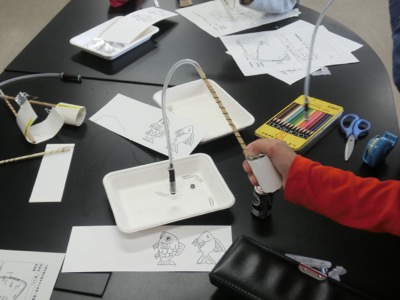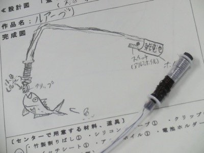 子どもたちは、電磁石を使ったおもちゃの設計図を書いてきました。この子は、釣竿を作るようです。