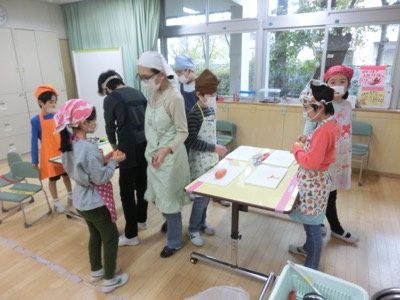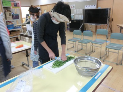 こだま学級は調理学習です。身だしなみを整え、道具を準備して始めます。