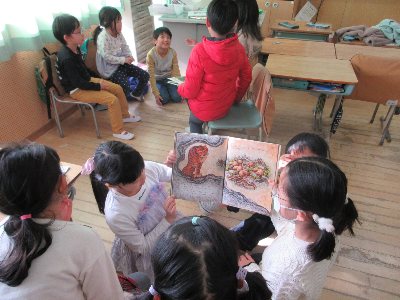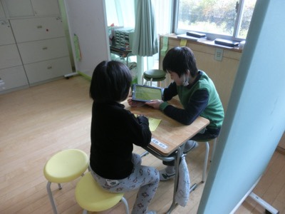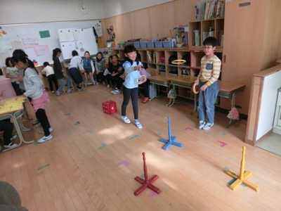 こだま学級の教室に他の子どもたちが遊びに行く「フェスタこだま」という機会があります。通常の学級と特別支援学級の交流を図る取り組みです。今日は、3-2の子どもたちが遊びに来ていました。これは「ものあてゲーム」をしているところです。
