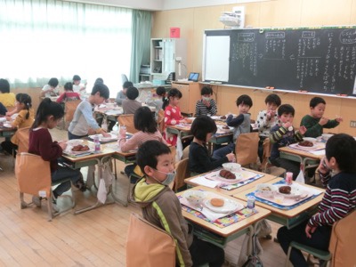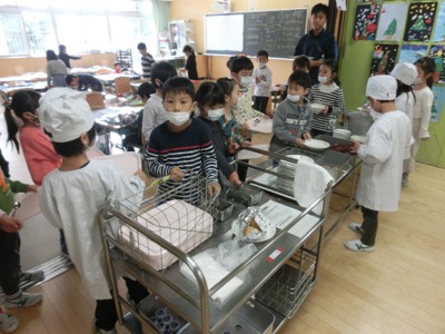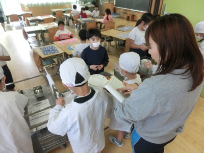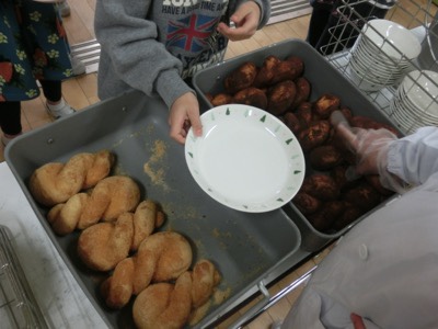 今日の給食は、「リザーブ(予約)給食」でした。揚げパンのきなこ味とココア味のどちらが食べたいか、事前に予約しておくのです。これは1-3の給食当番の様子です。