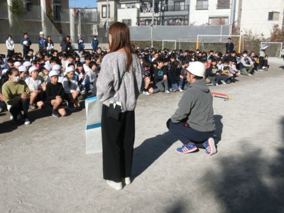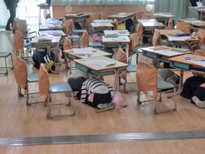 「訓練!地震です」という放送が流れました。教室にいる子どもたちはすばやく机の下に入りました。これまでの訓練が身に付いています。