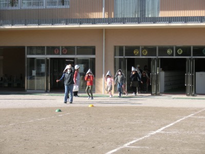 避難経路を通って校庭に避難します。