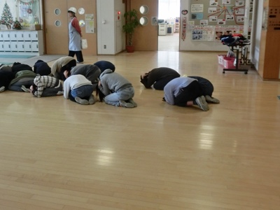 今日は、大きな地震が発生して避難する途中で、余震が襲ってきたという想定です。物が落ちてこない場所で身を守る姿勢を取りました。