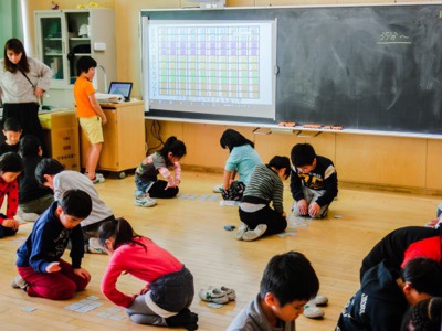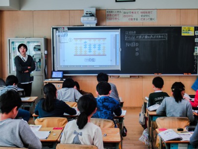 こちらは4-3の算数でそろばんを学習しているところです。先日お知らせしたようにプロジェクターが新しくなったので、今日は日差しの明るい日でしたが画面がよく見えるようになりました。