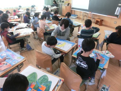 1-1が図工の授業で絵を描いていました。「のってみたいないきたいな」というテーマで、乗り物や行ってみたいところを想像して描いているようです。