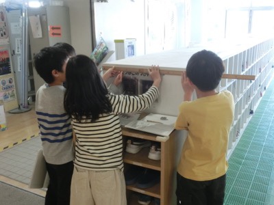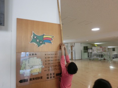 2-1は長さの学習をしているようです。1mのものさしを持って、校内のいろいろな場所の長さを測っていました。