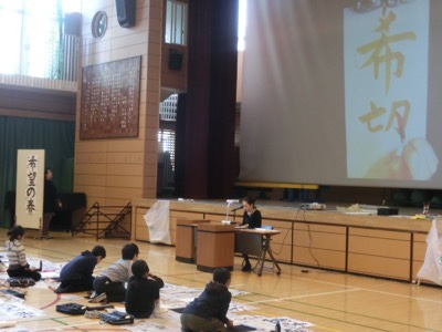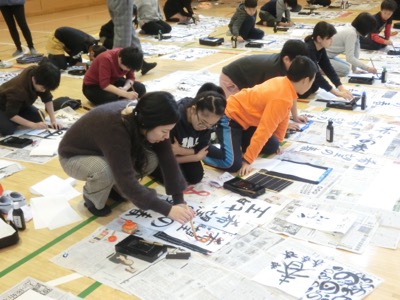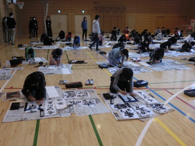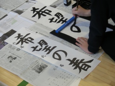 今日は6年生がアリーナで書き初めの練習です。昨日に引き続き、地域の書道の先生とサポーターのみなさんが指導してくださいます。6年生の題は「希望の春」です。