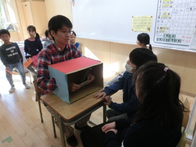「ものあて」には担任の城鼻先生も挑戦!残念ながら不正解でした。こだま学級の子どもたちと通常の学級の子どもたちが、自然に触れ合っている様子はとても微笑ましいです。