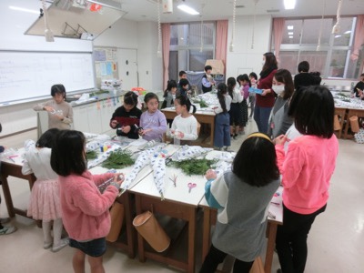 今日は学校支援本部(AW)主催の土曜日学校「ハッピィさたでぃ(略称ハピさた)」。12月のハピさたは、まず家庭科室で生け花をしました。50人以上の子どもたちが参加しました。