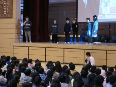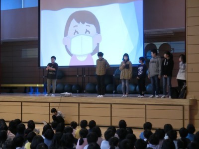 今朝は「健康朝会」。月1回、体育や保健に関する内容の朝会があります。今日は、保健委員会から、インフルエンザや風邪の予防について話がありました。手を洗わずにご飯を食べてしまった男の子にバイキンたちが襲いかかるという寸劇です。