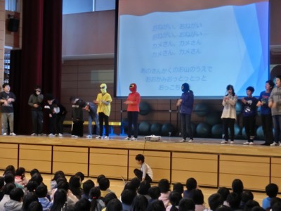 正義のヒーローたちが登場して、手洗いの歌を歌いました。