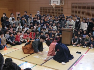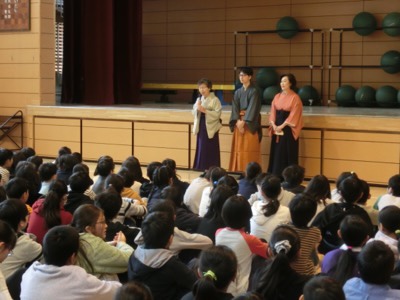 アリーナで1・3・5年生が百人一首の模範演技を見せてもらいました。杉並かるた会の方々が和服姿でいらっしゃいました。