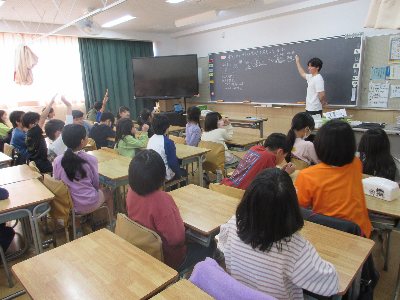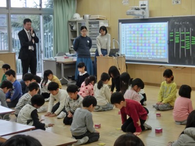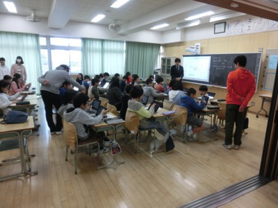 4年生はプログラミングの授業です。これも個別のサポートが必要なので、中学生が活躍していました。
