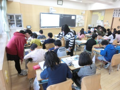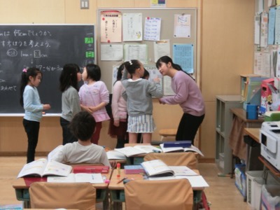 3年生は少人数算数の授業です。中学生が先生とともに個別指導をしていました。