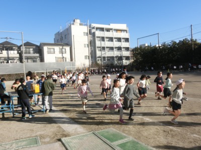 寒いけれどいい天気の朝。今日は1年・3年・こだま学級の子どもたちが校庭でかけ足です。