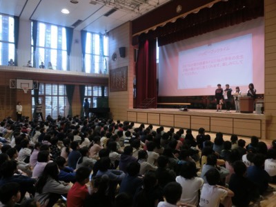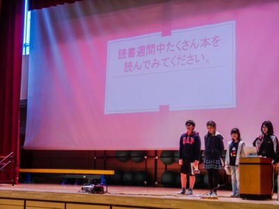 今朝の全校朝会は、図書委員会から読書週間の取組について発表がありました。ハッピーブックタイムやスタンプラリーなどが行われます。