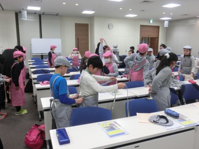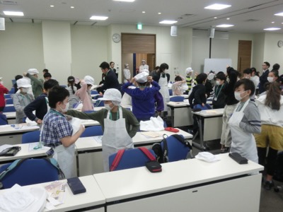 講義のあと、実習研修が始まります。厨房での寿司作り、スーパーのレジ接客、衣料品売場の接客と陳列の3つのグループに分かれます。寿司作りのグループは身支度をしました。