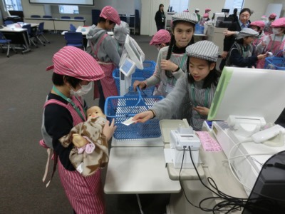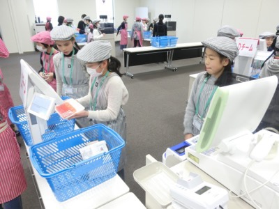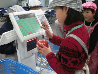 バーコードのない青果などは手で入力します。最近はセルフレジなどもあるからか、子どもたちも手慣れている感じがしました。