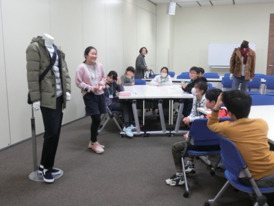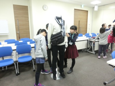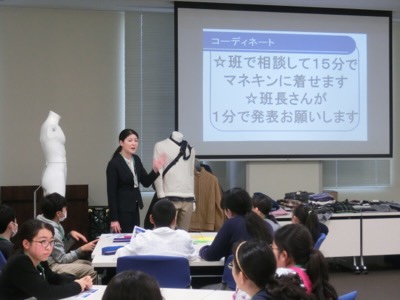 続いて、おすすめのコーディネートをマネキンに着せて提案する、という実習をしました。テーマを決めて、色や組み合わせを考えます。
